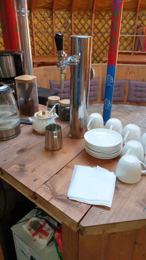 Spannend sind auch Jonas´ Geschichten über die mühsame Entstehung des Zeltdorfs – er hat sich ohne jede Vorkenntnisse in das Projekt gestürzt. Im ersten Winter kam plötzlich der Anruf: „Die Jurte ist eingestürzt.“ Zu viel Schnee. Solche Rückschläge gab´s zuhauf – „wir müssen halt draus lernen“, meint Jonas, der dann selbst eine solide Holzkonstruktion für die neue Jurte entworfen hat. Gefühlt halb Tago arbeitet für ihn. Ganz klassisch: Die Frauen managen die Küche und die Reinigung, die Männer sind Handwerker, Fahrer und Rezeptionisten. Was ich besonders spannend fand: Die ganze Hardware – Planen, Zelte, Jurten, ein Großteil der Konstruktionen, die alles halten – hat sich Jonas aus dem Internet besorgt. Das Zauberwort ist die chinesische Plattform Alibaba. „Du musst nur bis zur letzten Naht ganz genau wissen, was Du willst – irgendjemand findet sich auf Alibaba, der das auf Basis Deiner Wünsche für Dich anfertigt.“