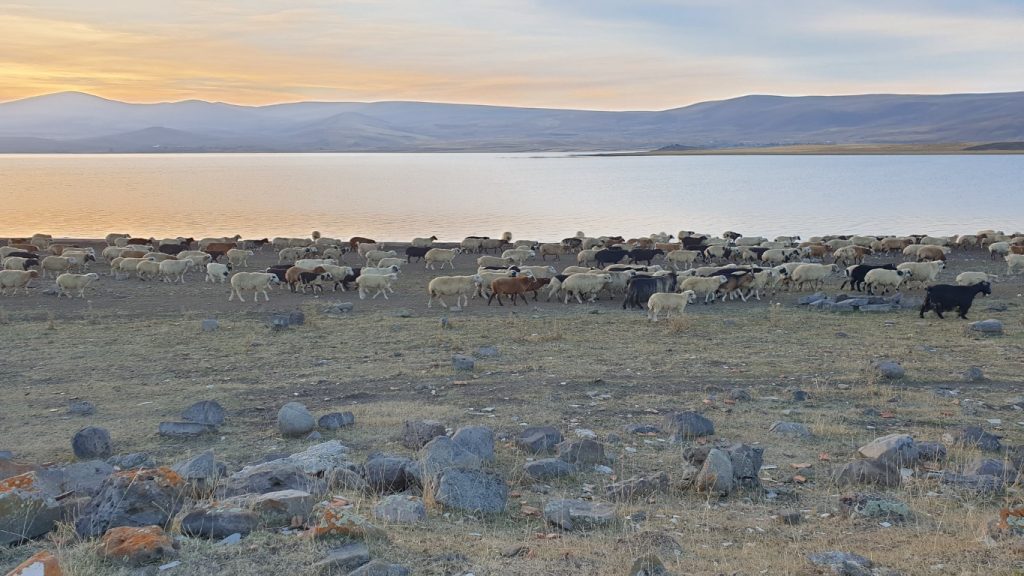 Abends werden Hunderte Schafe am See entlang in ihre Ställe getrieben. Die Schäfer halten Kangals zum Schutz ihrer Herden vor Raubtieren. In Georgien bin ich zweimal auf dem Rad von Wachhunden attackiert worden – ging glimpflich aus. Um die Reviere der wirklich Respekt einflößenden Kangals habe ich einen großen Bogen gemacht.