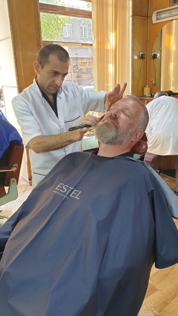 Ich war in Gyumri erst einmal wieder beim Barbier, dem ältesten Armeniens. Zuhause lege ich mit einem Elektrorasierer selbst Hand an, im Ausland gehe ich immer gerne zum Friseur. Zum Schluss gab´s sogar einen echten osteuropäischen Seitenscheitel.