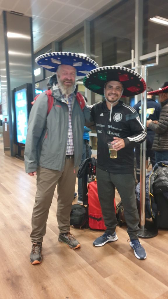 Trotzdem sitze ich mit gemischten Gefühlen im Flieger Richtung Zwischenstopp Istanbul. Erst am Gate zum Weiterflug nach Doha bin ich zum ersten Mal wirklich sicher, dass meine Entscheidung die richtige ist. Der Grund ist Rodrigo, ganz in Grün gewandet unschwer als Mexikaner zu erkennen. Rodrigo stülpt mir kurzerhand einen Sombrero über und nimmt mich in die Arme. Mein Spanisch ist im Laufe der letzten Jahre ziemlich verschütt gegangen – aber so viel verstehe ich doch in unserer kurzen Unterhaltung: „Armer Deutscher, wo sind Deine Emotionen? Es ist Fußball.“