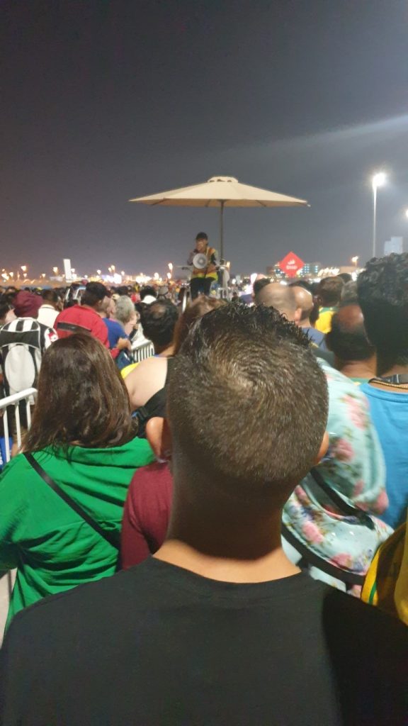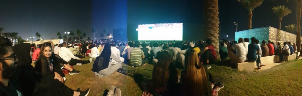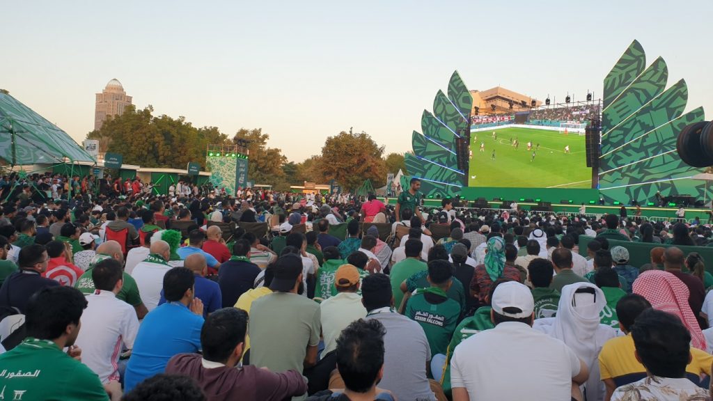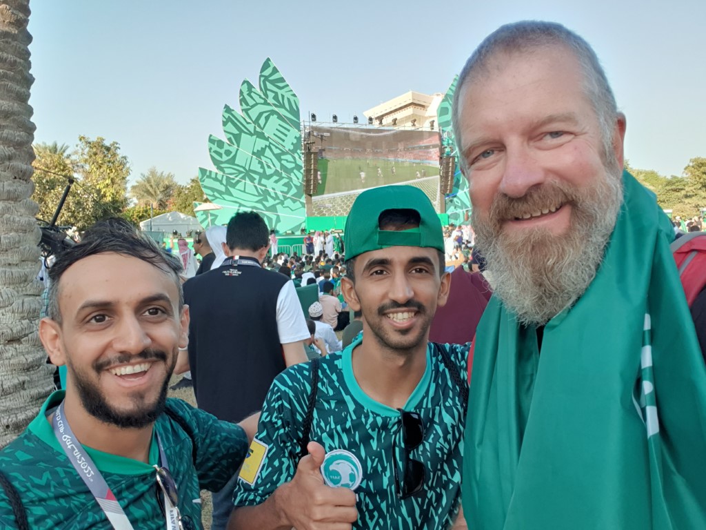 Das Public Viewing ist ein ganz besonderes Erlebnis: Vorher gibt´s saudische Folklore – und dann einen arabischen Kommentator, von dem ich zwar fast nichts verstehe, der mir aber trotzdem in Erinnerung bleibt. Während Béla Réthy und Co. auch mal eine Pause machen, redet der Reporter hier in einem durch. Seine Emotionen würde er nie bremsen und beinahe in jeder Minute wird Gott bemüht. Findige Journalisten haben nachgezählt, dass der Kommentator nach dem 2:1-Siegtreffer gegen Argentinien nicht weniger als sechsmal Allah gepriesen hat, bevor er seine Lobeshymne auf den Siegtorschützen anstimmte.