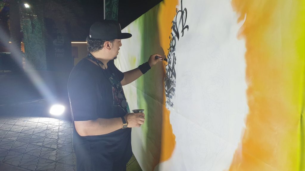 Nach dem Ende der Partie schlendere ich noch über das Gelände des Saudi House und unterhalte mich kurz mit Big Moe. Er ist ein Graffiti- und Kalligraphie-Künstler aus Riad und malt an einem riesigen Bild von Yasser Al-Sharani. Der linke Verteidiger war beim Sieg über Argentinien mit dem eigenen Torwart zusammengeprallt und hat mehrere Knochenbrüche und innere Blutungen erlitten. „Er ist bei uns ein Held“, sagt Big Moe.
