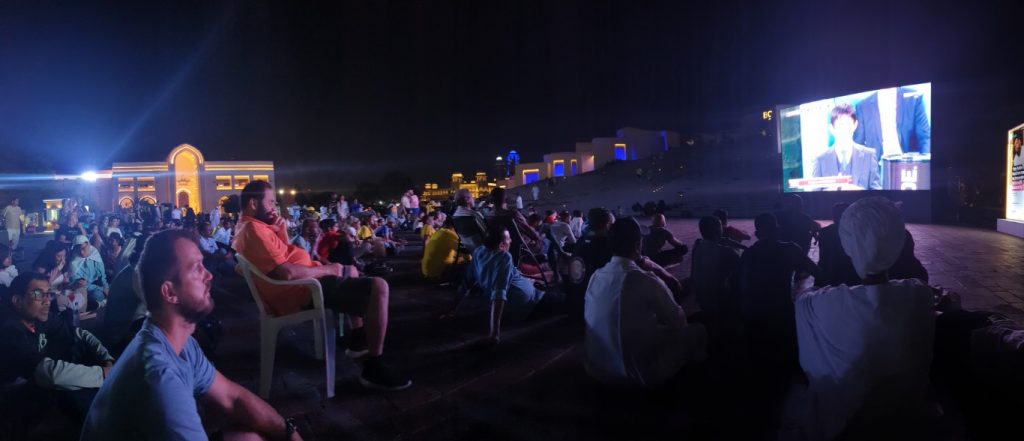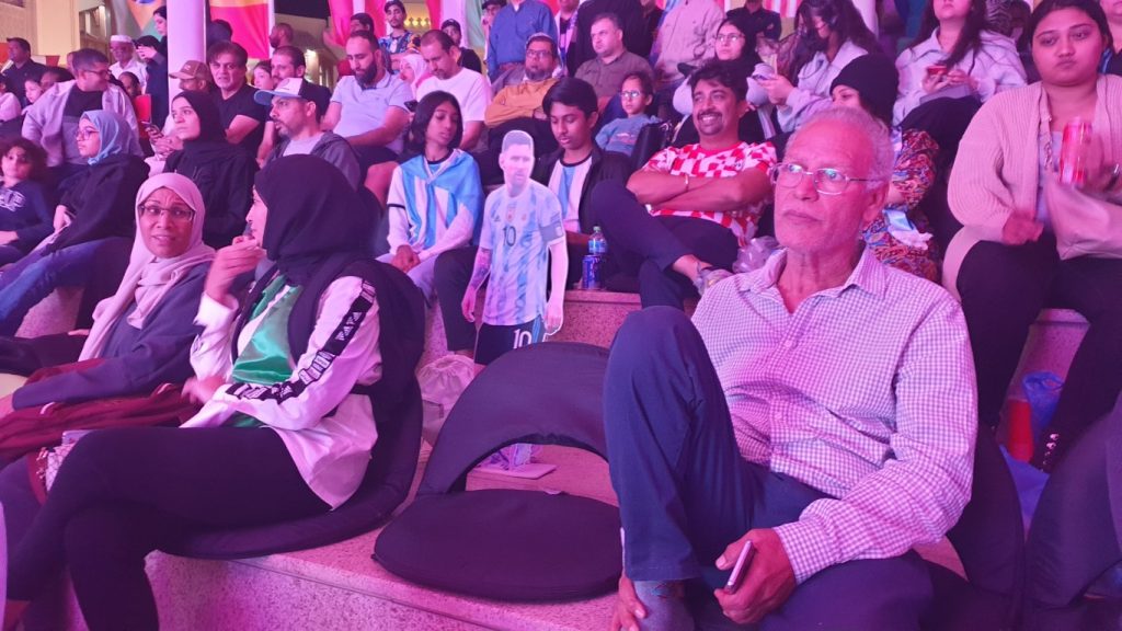 In Doha geht das nirgendwo besser als im „Saudi House“. Katar hat nur eine Landgrenze – mit Saudi-Arabien. Viele Saudis sind zur WM angereist. Ihre Regierung hat mit dem Saudi House eine eigene Fan-Botschaft eingerichtet. Direkt am Hochhaus-Viertel „West Bay“ in Strandlage präsentieren sich hier die Regionen des Landes, das in Zukunft mehr Touristen anziehen möchte. Im Zentrum des Saudi House steht natürlich ein großer Bildschirm für Public Viewing, die Anlage hat eine Kapazität für mehrere Tausend Fans.