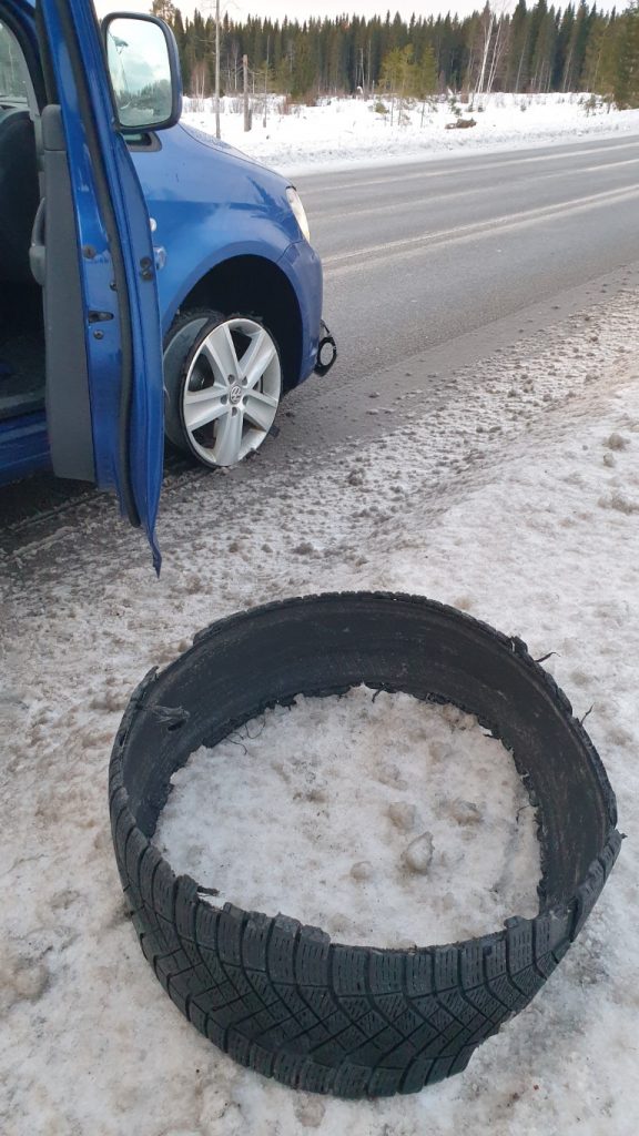 Nun begutachtete Pettar ziemlich ratlos den Schaden an seinem VW Caddy. Ein Reserverad fand er nicht – geschweige denn einen Wagenheber, ein Warndreieck, Warnwesten oder auch nur irgendein Werkzeug. `Muss an meinem perfekten Bild von Schweden arbeiten´, musste ich unwillkürlich in mich hineingrinsen.
