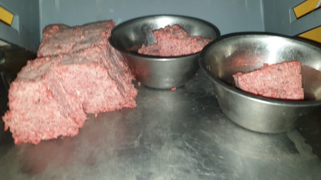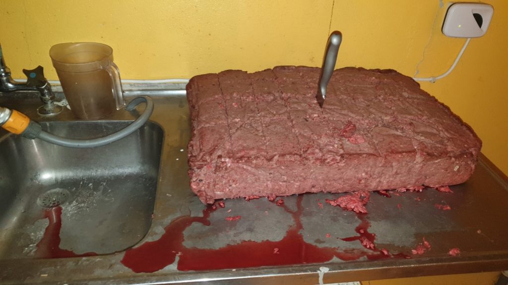Nein – für Zartbesaitete ist der Job hier nichts. Vor zwei Tagen kam ein LKW und hat eine Palette Hundefutter ausgespuckt. Über eine halbe Tonne tiefgefrorenes Fleisch, das Kris und ich in zwei Stunden mit Beil und Vorschlaghammer so bearbeitet haben, dass die Stücke in die Tiefkühltruhe passen.