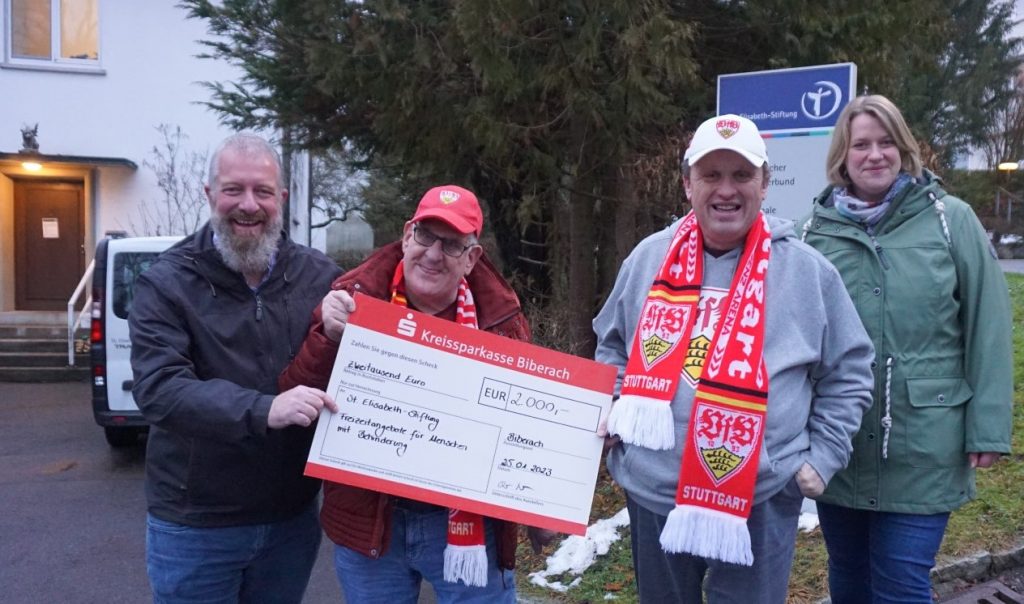 Karl-Alexander Kleinheinz und Paul Moll von der Wohngemeinschaft Simon im Jordanbad haben den symbolischen Scheck zusammen mit Anna Weber, der Leiterin Fundraising und Fördermanagement der St. Elisabeth-Stiftung, bekommen. Vielleicht klappt´s ja mit einer Fahrt zum VfB.