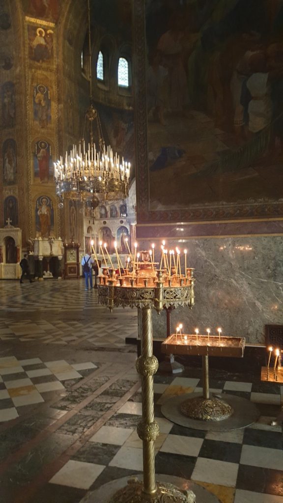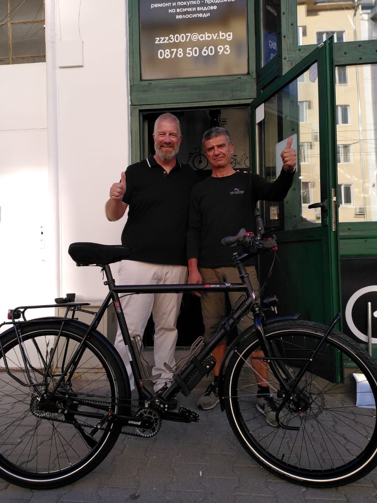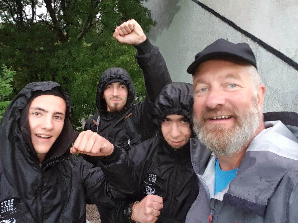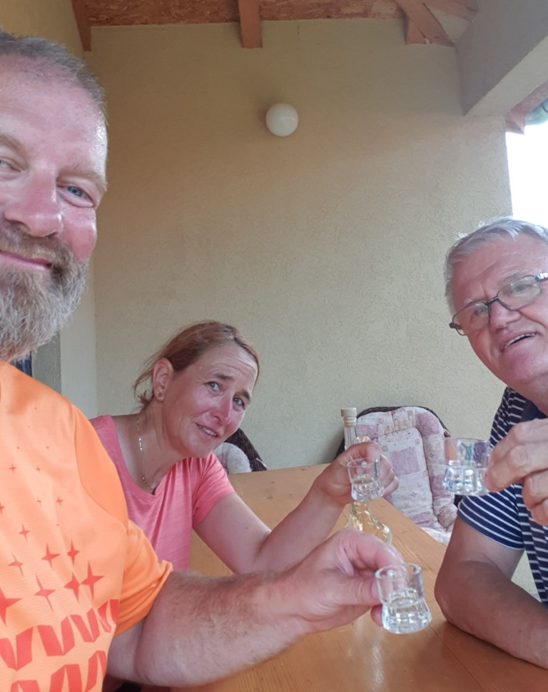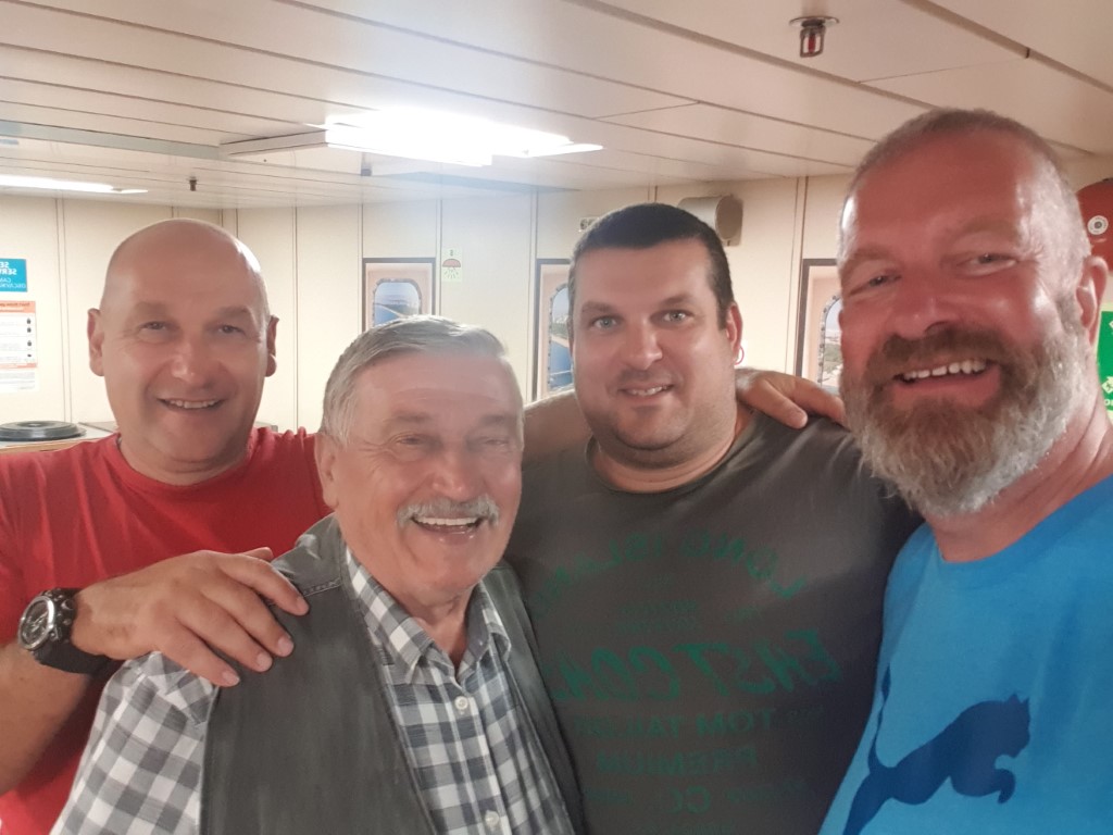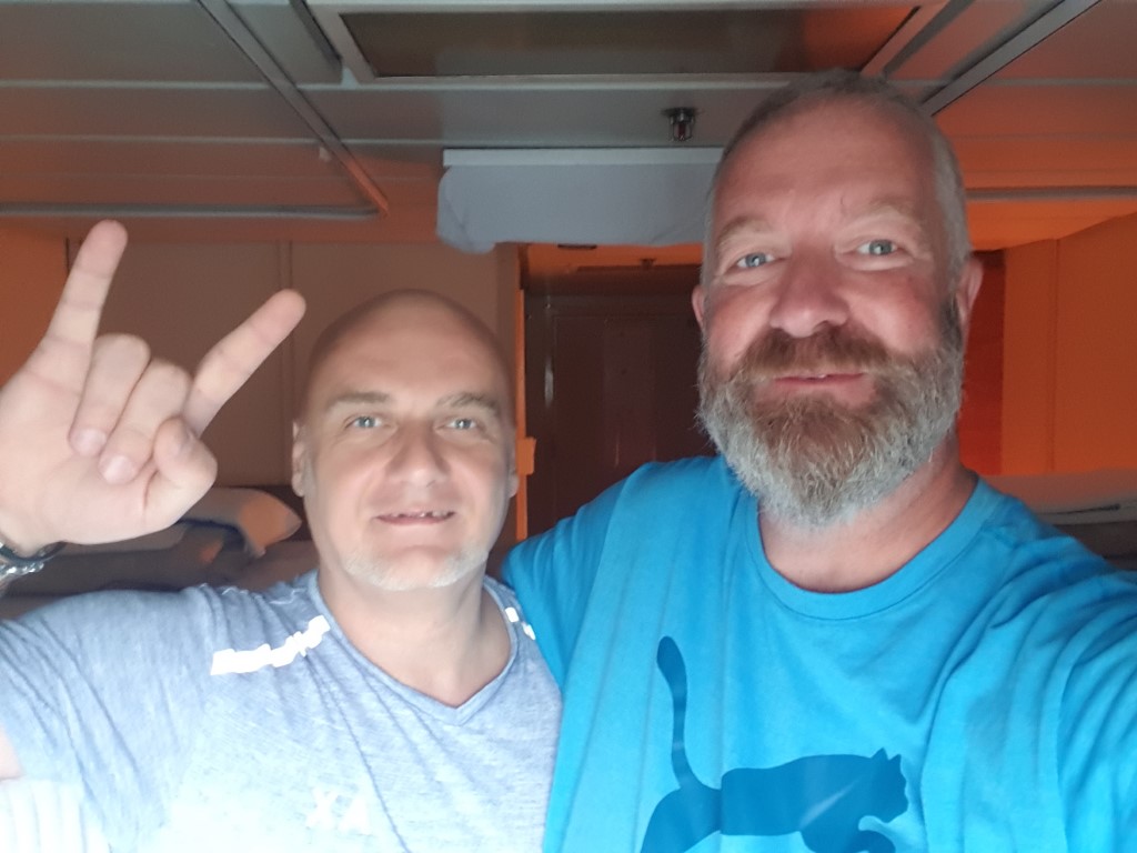 Auf so engem Raum lernt man in drei gemeinsamen Tagen zwangsläufig jede Menge Leute kennen. Die beiden kräftigen Herren im Hintergrund fahren mit ihren LKW regelmäßig Autos von München nach Tiflis. Kyrill im Vordergrund ist 78 Jahre alt und mit dem Auto unterwegs von Sofia nachhause nach Rostow am Don. Er ist gebürtiger Bulgare, hat aber in Russland studiert und sich als Ingenieur dort etwas aufgebaut. 3 Enkel leben in Sofia, 3 in Rostow. Er hat einen Hang zu selbst gebranntem Vodka. Mich hat er auch versorgt – wirklich lecker, aber nach einem halben Glas musste ich mich schon hinlegen …