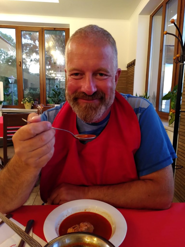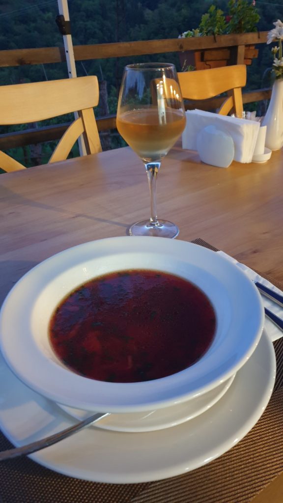 So viel aktuelle Weltpolitik bei mir am Tisch! Darauf gab´s erst mal einen Borschtsch. Heute Nacht hat mich leider Montezumas Rache erwischt – im Verdacht habe ich den kleinen Imbiss, wo ich mich gestern Mittag gestärkt habe. Mir geht es schon wieder besser, aber angesichts des Dauerregens draußen ist es mir nicht schwergefallen, hier im „Chateau Iveri“ eine Nacht dranzuhängen.