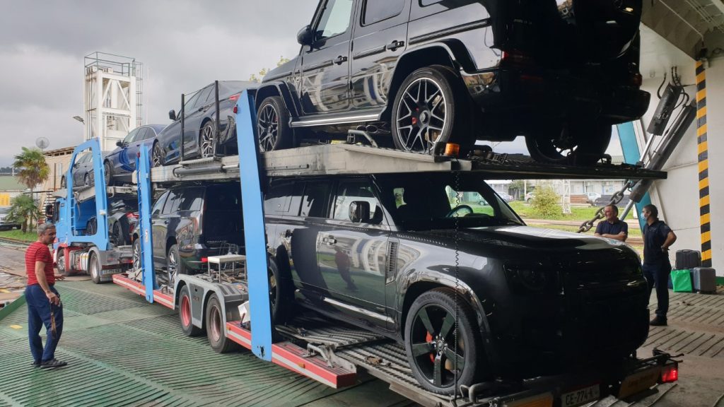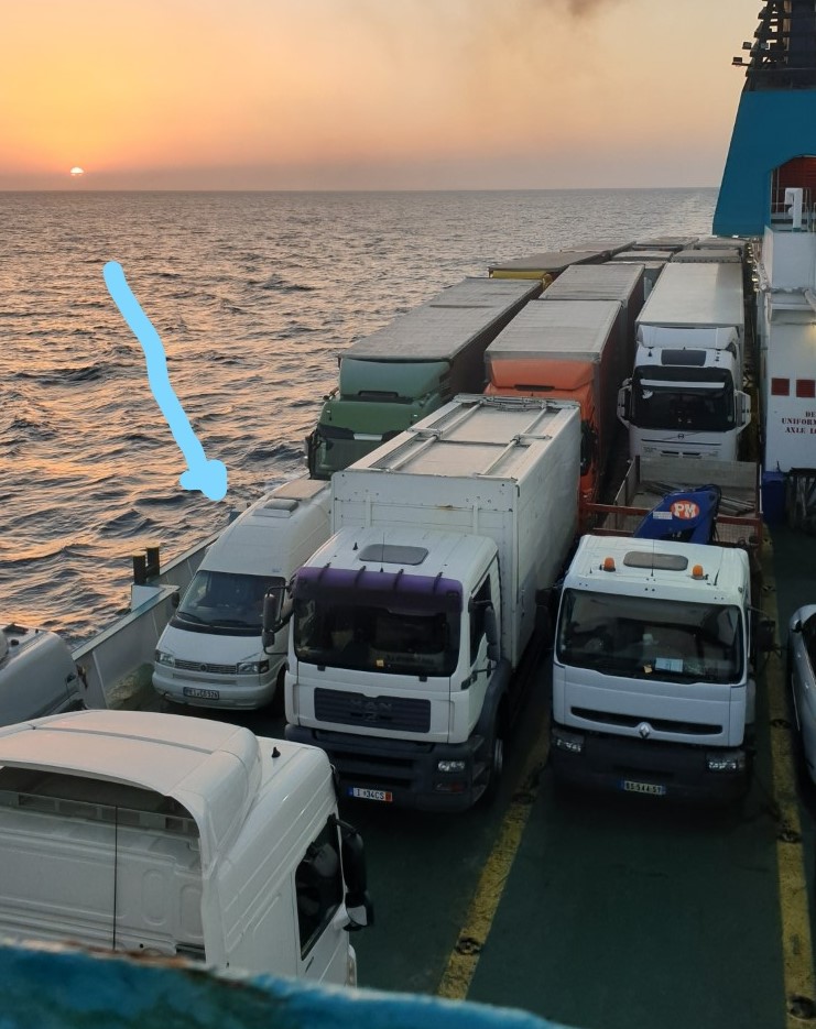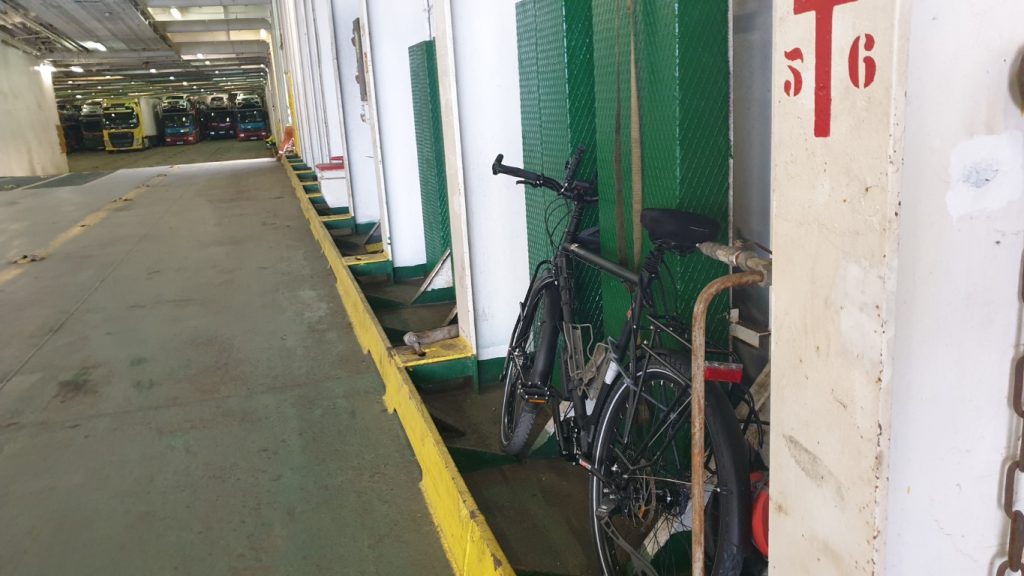 Nach den Zoll-Formalitäten – die Grenzpolizei kommt zur Fracht- und Passkontrolle aufs Schiff – musste ich eine ganze Weile warten, bis ich an mein Fahrrad herankam. War schon beeindruckend, was da so von Bord rollte. Allein auf diesem LKW Autos im Wert von geschätzt über einer halben Million €.