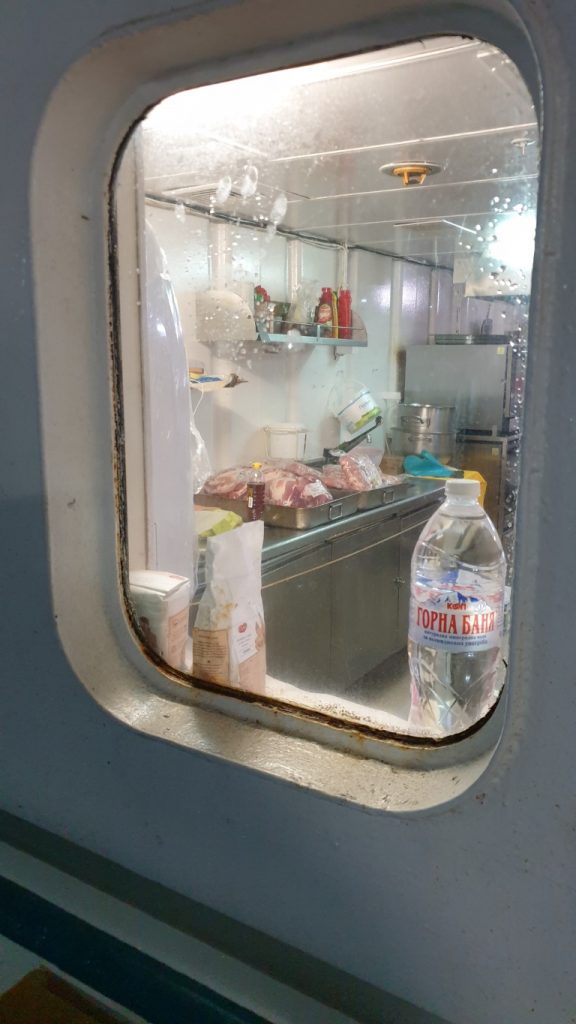 Ein Blick in die Kombüse: Juhu – morgen gibt´s Fleisch. Nicht nur morgen, sondern jeden Tag morgens, mittags und abends. Bei Blumenkohl-Lauch-Gratin hätten meine Mitfahrer den Smutje wohl auch schlicht über Bord gehen lassen.