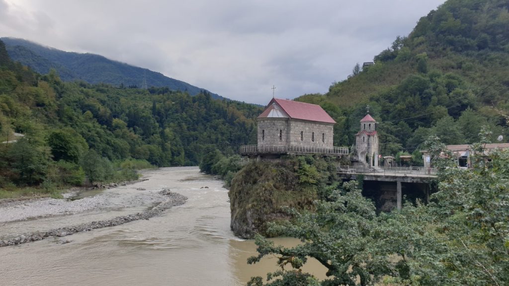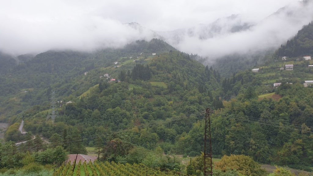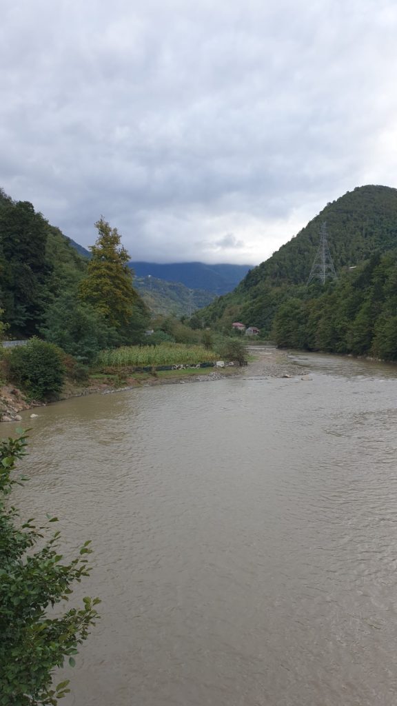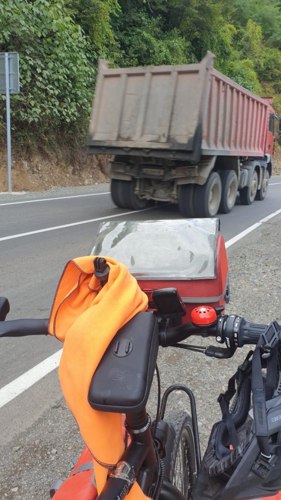 Leider spielt das Wetter momentan nicht mit. Es regnet extrem viel, aber am 22. September habe ich mich trotzdem wieder aufs Rad geschwungen und bin die ersten 50 Kilometer in den Kleinen Kaukasus hineingefahren. Der erste Eindruck der Natur ist toll – es nerven nur die LKW: Der Fluss, an dem meine Fahrt entlang geht, wird an mehreren Stellen ausgebaggert. Die Folge sind eine Menge Lastwagen, die Radfahrer nicht wirklich als gleichberechtigte Verkehrsteilnehmer betrachten.