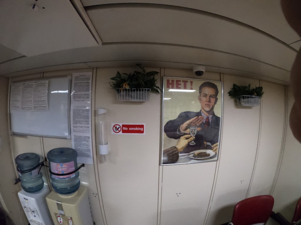 Das Poster an der Wand der Passagier-Messe ist fast schon ikonisch. Es stammt noch aus der Sowjet-Zeit und soll Männer vom Trinken abhalten. Sagen wir es so: Das Poster gehört irgendwie dazu, seine erzieherische Wirkung ist seit einem halben Jahrhundert aber überschaubar. Das Geschehen zwei Tische weiter habe ich an einem Abend für mich in eine Formel gebracht: 4g + 3v = 2h. 4 Georgier packten 3 Liter-Flaschen Vodka vor sich auf den Tisch. Nach 2 Stunden war alles leer. Das Bier zwischendurch nicht mitgezählt.
